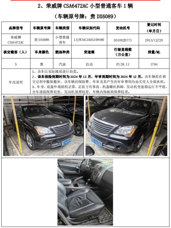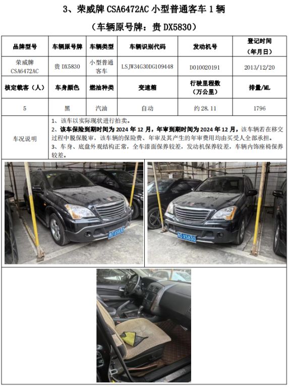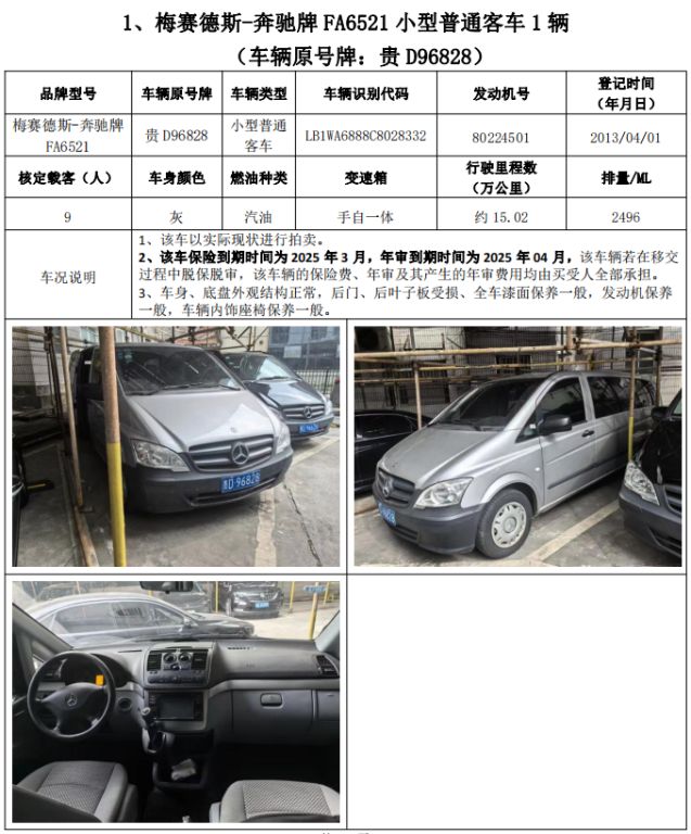 拍品編號(hào)1:梅賽德斯-奔馳牌FA6521小型普通客車(chē)1輛、榮威牌CSA6472AC小型普通客車(chē)2輛,共計(jì)3輛(整體拍賣(mài))