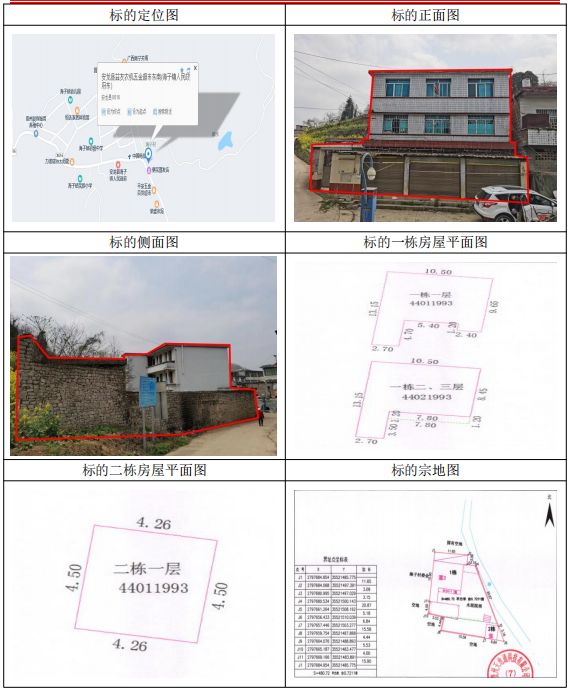 標的坐落于安龍縣灑雨鎮(zhèn)湯壩村街二組,房屋為自建房,由2幢房屋組成,證載總建筑面積:334.71㎡,實測總建筑面積:344.84㎡,其中1幢總層數(shù)為3層,證載建筑面積:316.19㎡,實測建筑面積:326.80㎡;2幢總層數(shù)為1層,證載建筑面積:18.52㎡,實測建筑面積:18.04㎡;房屋產(chǎn)權(quán)證號:安房權(quán)證灑雨鎮(zhèn)字第00003468號,設(shè)計用途分別為辦公住宅、其它,混合結(jié)構(gòu);土地使用權(quán)證號:安國用(2014)第14號,證載土地使用權(quán)面積:211.87㎡,實測土地使用權(quán)面積:211.83㎡,地類(用途):金融用地,使用權(quán)類型為出讓,終止日期為2054年11月22日止。