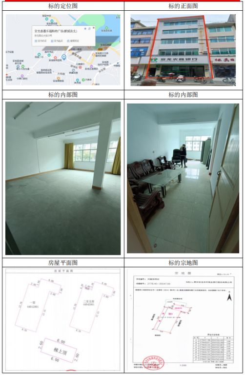 標的坐落于安龍縣新安鎮(zhèn)順城街9號,房屋為自建獨幢房屋,總層數(shù)為5層,證載建筑面積:472.70㎡,實測建筑總面積:474.41㎡,房屋產(chǎn)權(quán)證號:安房權(quán)證新安鎮(zhèn)字第00000969號,設(shè)計用途為商住,混合結(jié)構(gòu);土地使用權(quán)證號:安國用(2014)第6號,證載土地使用權(quán)面積:89.6㎡,實測土地使用權(quán)面積:91.09㎡,地類(用途)為金融用地,使用權(quán)類型為出讓,終止日期為2049年11月11日止。