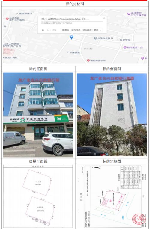 標的坐落于安龍縣坡腳鄉(xiāng)政府院內(nèi),房屋為自建獨幢房屋,總層數(shù)為2層,證載建筑面積:318.4㎡,實測建筑面積:319.76㎡,房屋產(chǎn)權(quán)證號:安房權(quán)證坡腳鄉(xiāng)字第00003456號,設(shè)計用途為辦公住宅,混合結(jié)構(gòu);土地使用權(quán)證號:安國用(2014)第21號,證載土地使用權(quán)面積:190.81㎡,實測土地使用權(quán)面積:183.8㎡,地類(用途):金融用地,使用權(quán)類型為出讓,終止日期為2054年11月22日止。