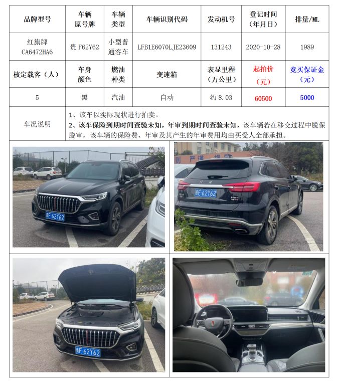 拍品編號1:紅旗牌CA6472HA6小型普通客車1輛