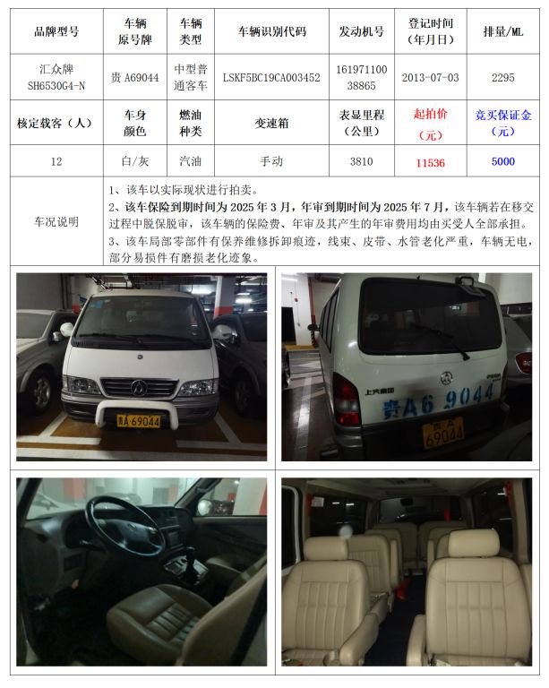 拍品編號2:匯眾牌SH6530G4-N中型普通客車1輛