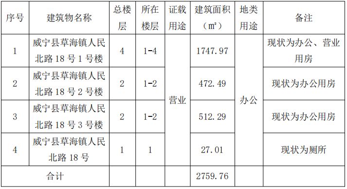標的坐落于威寧縣草海鎮(zhèn)人民北路18號稱為1號樓、2號樓和3號樓的三項房屋,房屋建筑面積為:2759.76㎡,混合結構,房屋總層數為4層,拍賣標的所在層數為1-4層,產權證號:威房權證草海鎮(zhèn)字第00007730號,設計用途為營業(yè)。土地證號:威國用(2009)第133號,地類(用途):辦公用地,使用權類型:作價出資,使用權面積:1854.70㎡。