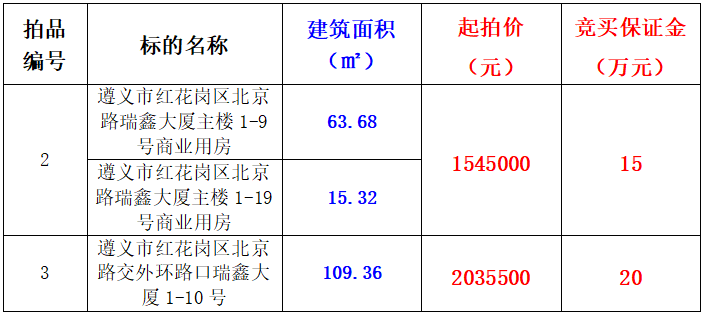 2、遵義市紅花崗區(qū)北京路瑞鑫大廈主樓1-9、1-19號商業(yè)用房(整體拍賣),建筑面積:79㎡,起拍價:1545000元,競買保證金:15萬元;