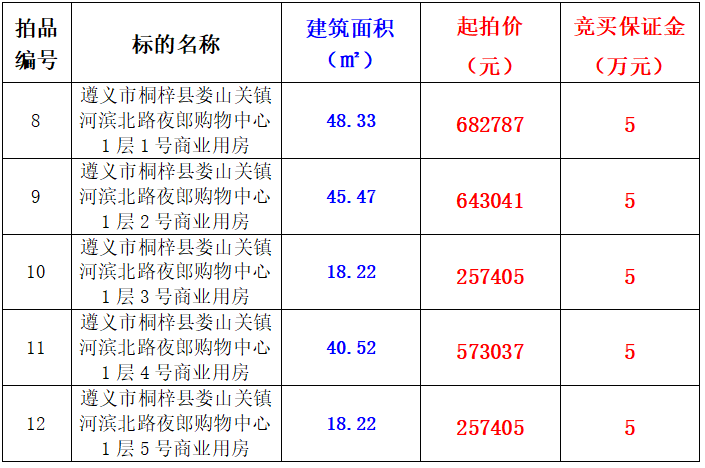 8、遵義市桐梓縣婁山關(guān)鎮(zhèn)河濱北路夜郎購物中心1層1號商業(yè)用房,建筑面積:48.33㎡,起拍價:682787元,競買保證金:5萬元;