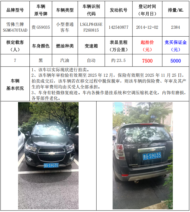 1、雪佛蘭牌SGM6470TAAD小型普通客車1輛,起拍價(jià):7500元,競(jìng)買保證金:5000元。