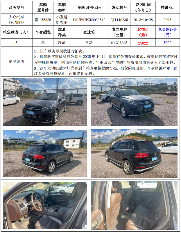 2、大眾汽車WVGAB97P小型越野客車1輛,起拍價(jià):25022元,競(jìng)買保證金:5000元。