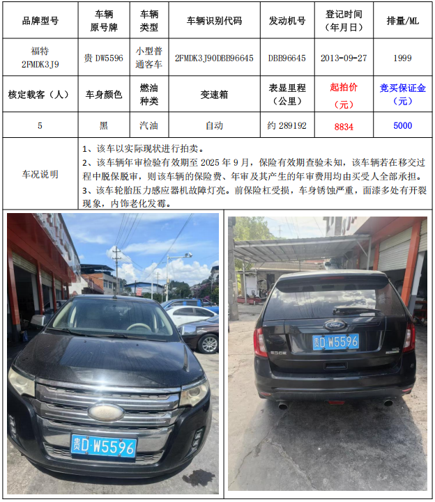 3、福特2FMDK3J9小型普通客車1輛,起拍價(jià):8834元,競(jìng)買保證金:5000元。
