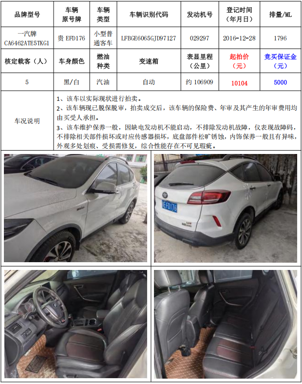 拍品編號2:一汽牌CA6462ATE5TKG1小型普通客車1輛(車輛原號牌:貴EFD175)