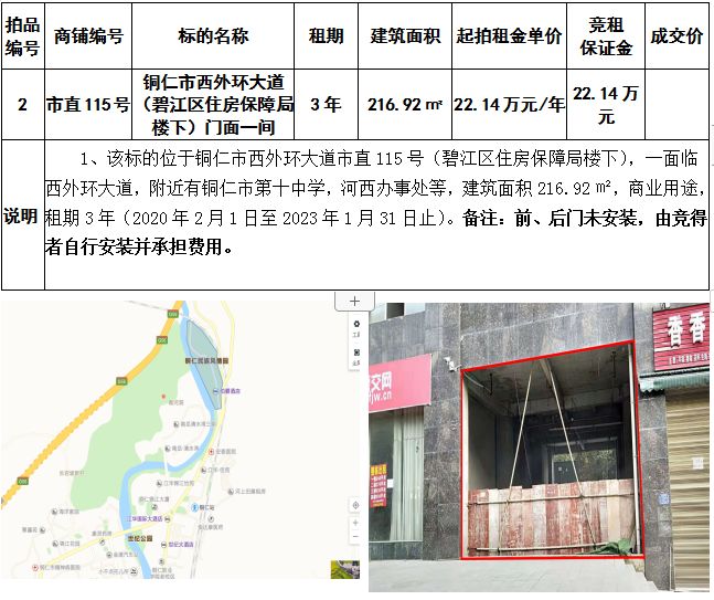2、銅仁市西外環(huán)大道(碧江區(qū)住房保障局樓下)門面一間3年租賃權(quán)(建筑面積:216.92㎡);起拍租金單價(jià):22.14萬(wàn)元/年;競(jìng)租保證金:22.14萬(wàn)元;