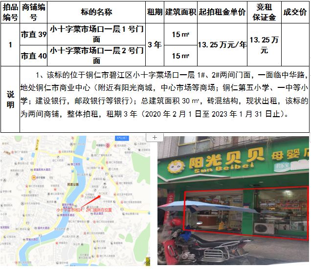 1、小十字菜市場(chǎng)口一層1-2號(hào)兩間門面3年租賃權(quán)(總建筑面積30㎡);起拍租金單價(jià):13.25萬(wàn)元/年;競(jìng)租保證金:13.25萬(wàn)元;