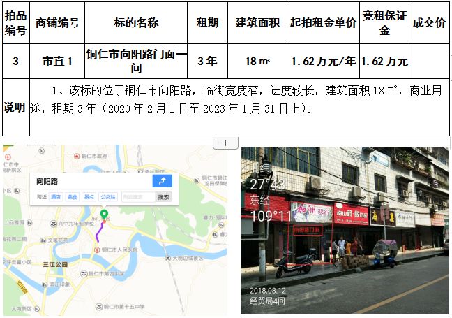 3、銅仁市向陽(yáng)路門面一間3年租賃權(quán)(建筑面積:18㎡);起拍租金單價(jià):1.62萬(wàn)元/年;競(jìng)租保證金:1.62萬(wàn)元。