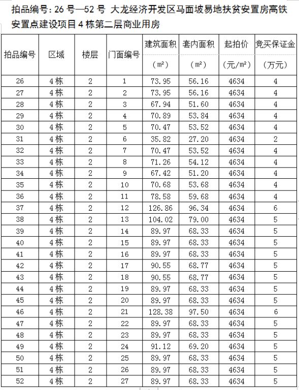 3、大龍經(jīng)濟(jì)開發(fā)區(qū)馬面坡易地扶貧安置房高鐵安置點(diǎn)建設(shè)項(xiàng)目4棟第三層商業(yè)用房23間,建筑面積為54.88㎡-102.06㎡,起拍價(jià):3370元/㎡,競(jìng)買保證金2—4萬元/間;