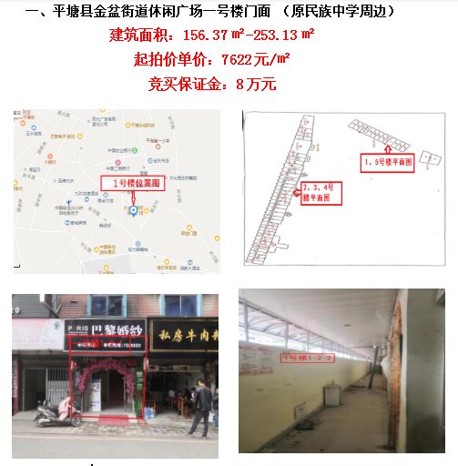 標的位于平塘縣金盆街道休閑廣場,相當于縣中心,人流量大,交通便利,停車場數(shù)量多,商業(yè)繁華程度較好;一號樓建成于1995年,總層數(shù)7層,1-2層為商業(yè);建筑面積:156.37㎡-253.13㎡,建筑結(jié)構(gòu)為磚混,外墻為貼磚,土地性質(zhì):國有劃撥,土地用途:商業(yè)用地;區(qū)域內(nèi)公共配套設(shè)施有平塘民族中學、平塘中等職業(yè)學校、貴品廣場等。