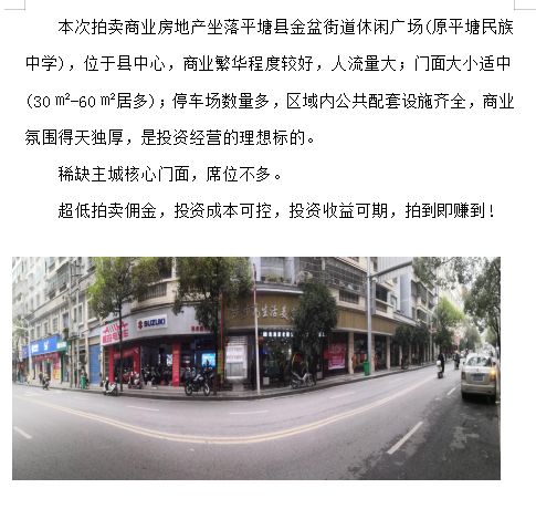 標的位于平塘縣金盆街道休閑廣場,相當于縣中心,人流量大,交通便利,停車場數(shù)量多,商業(yè)繁華程度較好;四號樓建成于2004年,總層數(shù)8層,1層為商業(yè);建筑面積:34.14㎡-151.19㎡,建筑結(jié)構(gòu)為磚混,外墻為貼磚,土地性質(zhì):國有劃撥,土地用途:商業(yè)用地;區(qū)域內(nèi)公共配套設(shè)施有平塘民族中學、平塘中等職業(yè)學校、貴品廣場等。