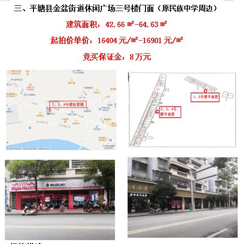 標的位于平塘縣金盆街道休閑廣場,相當于縣中心,人流量大,交通便利,停車場數(shù)量多,商業(yè)繁華程度較好;三號樓建成于2004年,總層數(shù)7層,1層為商業(yè);建筑面積:42.66㎡-64.63㎡,建筑結(jié)構(gòu)為磚混,外墻為貼磚,土地性質(zhì):國有劃撥,土地用途:商業(yè)用地;區(qū)域內(nèi)公共配套設(shè)施有平塘民族中學、平塘中等職業(yè)學校、貴品廣場等。