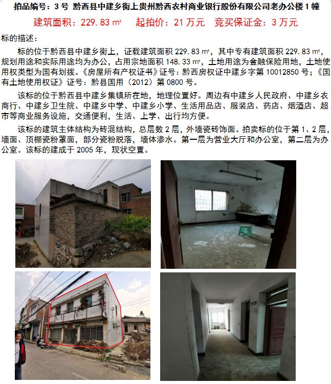三、黔西縣中建鄉(xiāng)街上貴州黔西農(nóng)村商業(yè)銀行股份有限公司老辦公樓1幢(建筑面積:229.83㎡)