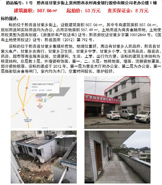 一、黔西縣甘棠鄉(xiāng)街上貴州黔西農(nóng)村商業(yè)銀行股份有限公司老辦公樓1幢(建筑面積:507.06㎡)