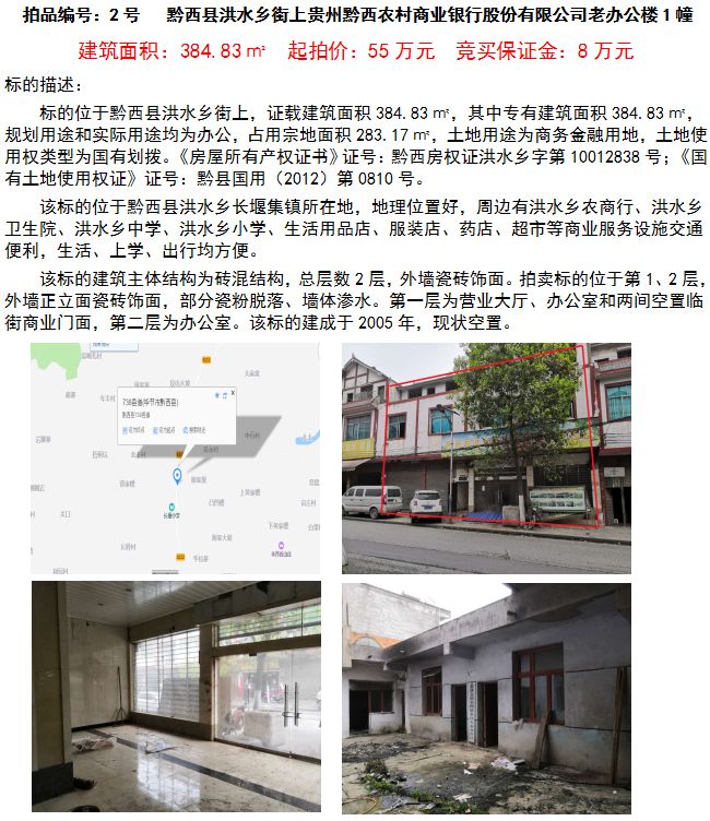 二、黔西縣洪水鄉(xiāng)街上貴州黔西農(nóng)村商業(yè)銀行股份有限公司老辦公樓1幢(建筑面積:384.83㎡)