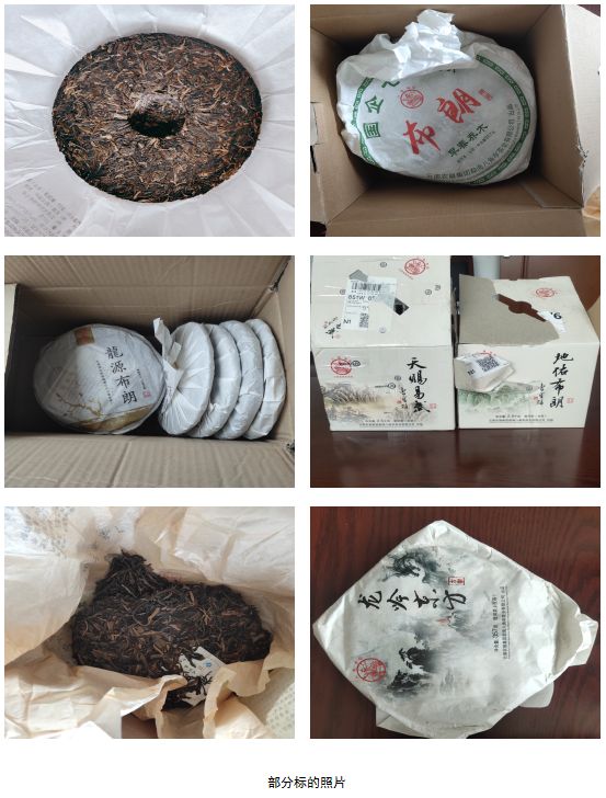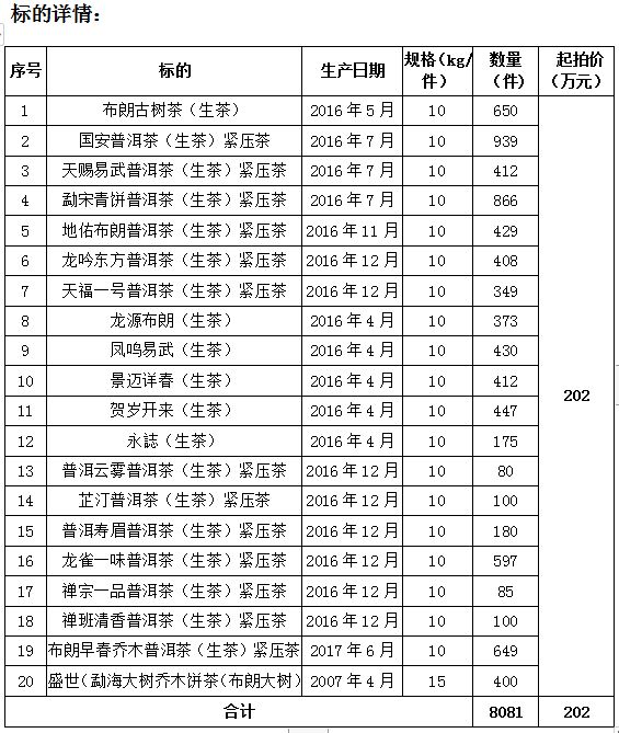 拍品編號1 布朗古樹茶(生茶)、國安普洱茶(生茶)緊壓茶、天賜易武普洱茶(生茶)緊壓茶、龍吟東方普洱茶(生茶)緊壓茶、龍源布朗(生茶)等20個品種共計8081件。