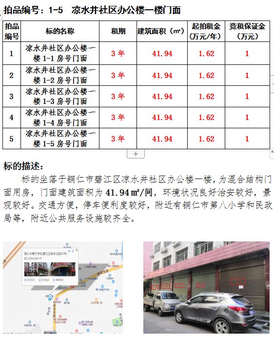 1、涼水井社區(qū)辦公樓一樓門面5間(1-1、1-2、 1-3、 1-4、 1-5)3年租賃權(建筑面積:41.94㎡/間);起拍租金單價(每間):1.62萬元/年;競租保證金(每間):1萬元;