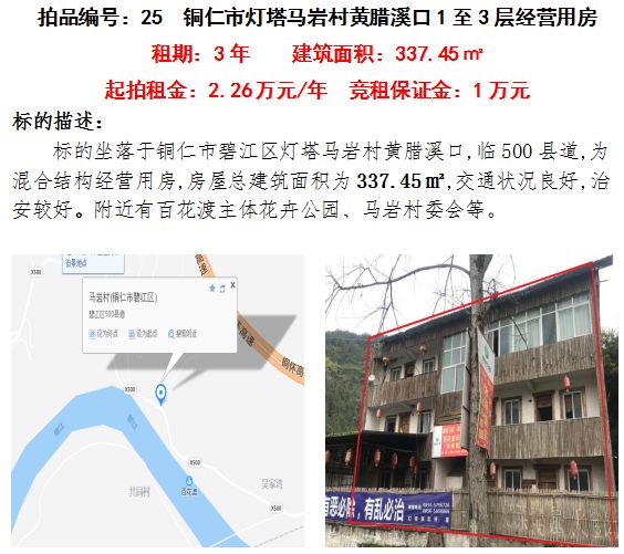 6、銅仁市碧江區(qū)燈塔馬巖村黃臘溪口1-3層經(jīng)營房3年租賃權(建筑面積:337.45㎡);起拍租金單價:2.26萬元/年;競租保證金:1萬元;